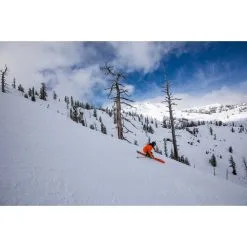 The Elan Amphibio skis are asymmetrical and equipped with a rocker using their 4D technology. The inside of the ski has a long solid edge for a lot of grip in the turn, while the material on the outside has been strategically removed to make it easy to maneuver in the turn.